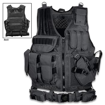 M48 OPS Tactical Cross-Draw Vest. It has multiple magazine pouches for fast reloading, a shotgun shell pouch, and a pocket for your goggles, cell phone or sunglasses. The pistol holster on the front ensures that your firearm is always within quick reach, and a strap holds it securely in place until you're ready to draw it. The MOLLE vest is made of heavy-duty 600D nylon and mesh material, which provides breathability to keep you cool, plus, it reduces the weight of the vest. An adjustable waist strap allows you to achieve a custom, comfortable fit and an emergency drag handle is incorporated into the top of the vest. Additional interior pockets allow for extra storage and organization.