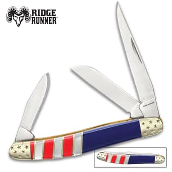 Every year, Kissing Crane releases a collectible trapper pocket knife to mark Independence Day and celebrate American Pride. This year, the Kissing Cane 2020 Fourth of July Trapper’s razor-sharp, stainless steel blades feature Uncle Sam and the Founding Fathers with the message, “We Declare Our Independence”. The handsome genuine bone handle is done in red, white and blue panels, separated by brass bands and accented with white stars and stripes. Brass-plated pins, bolsters and the classic Kissing Crane cast shield complete this exquisite design and each one is laser serialized on the bolster. If you haven’t started your collection of Kissing Crane Trappers yet, this is an excellent one to start out with!